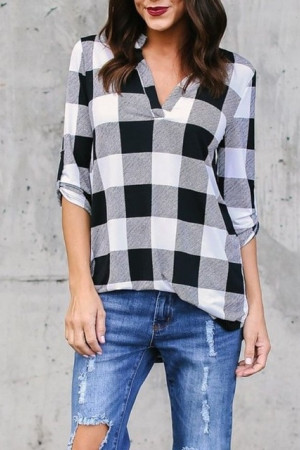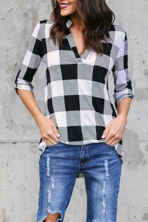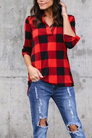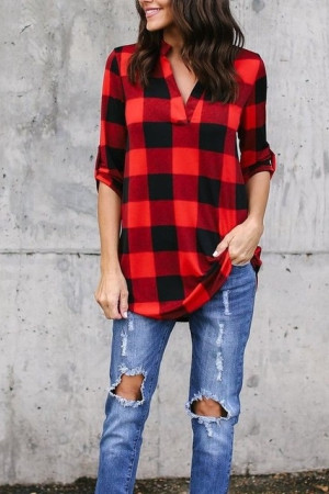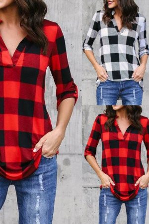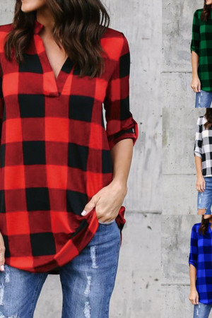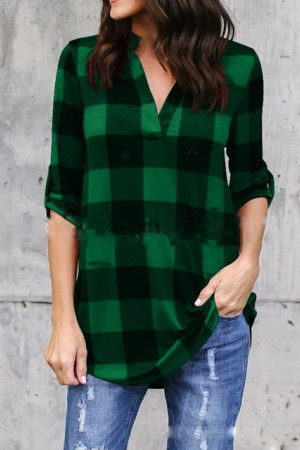 This casual plaid V-neck top is made of a blend of polyester and cotton with a broadcloth fabric type. It has a regular length, full sleeve length, and no decoration. It is suitable for spring and autumn seasons.