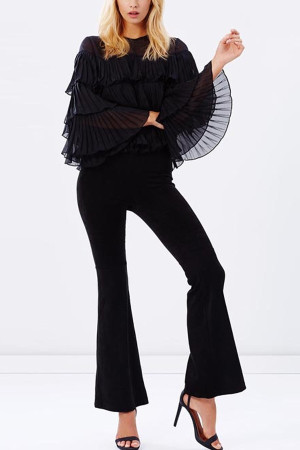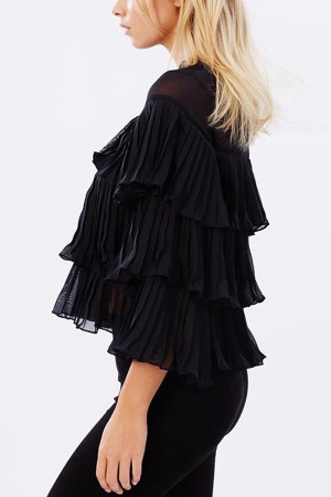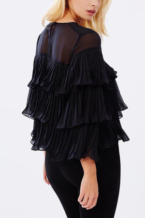 Show off your fashion sense of style in this trendy sexy blouse! Featuring round neckline, solid color, ruffles, layered design and pleated detailing.