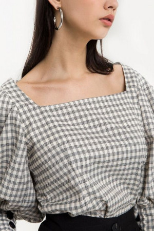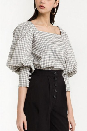 This chic blouse features a black and white gingham pattern, puff sleeves, a square neckline, and buttons down the front. It is perfect for adding a stylish touch to any outfit.