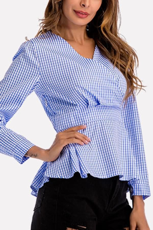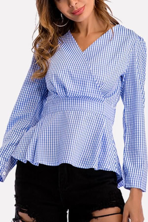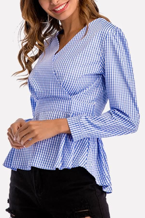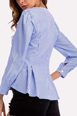 Timeless Elegance: Blue Gingham V-Neck Peplum Blouse