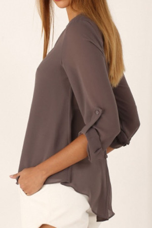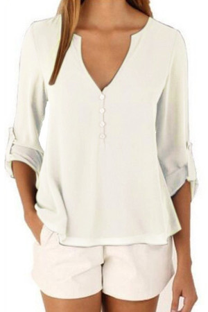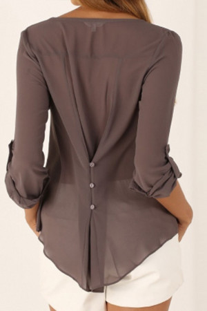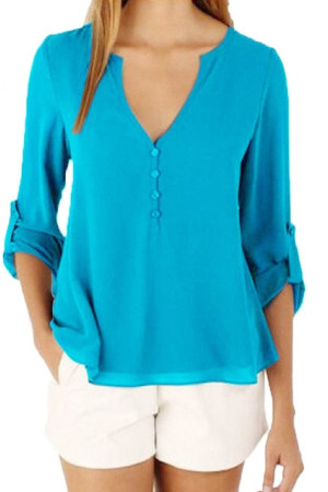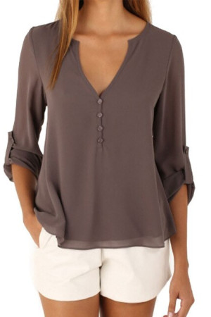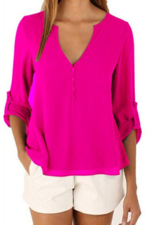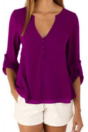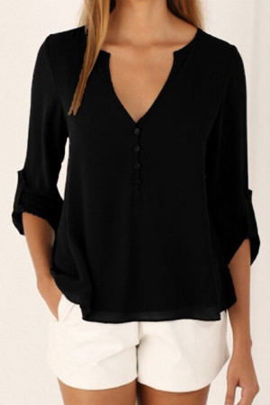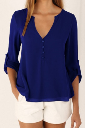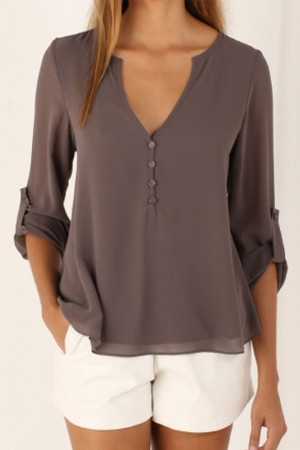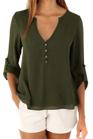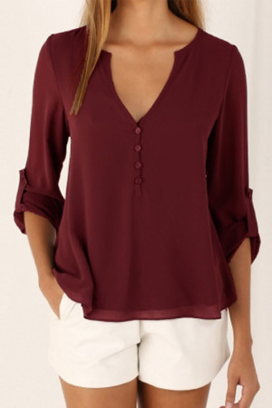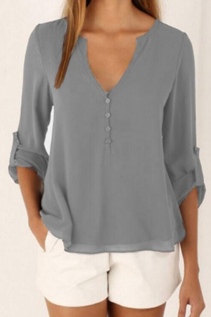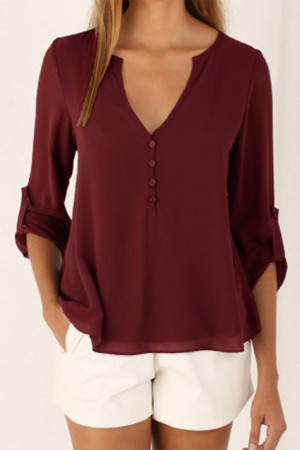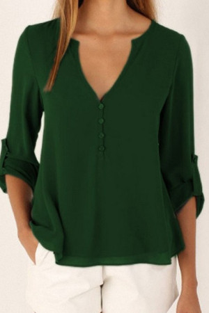 This casual-style garment is made of polyester and chiffon fabric, with a solid pattern and a loose fit. It has a regular clothing length, a full sleeve length, a V-neck collar, and a regular sleeve style. It is decorated with buttons and is suitable for everyday wear.