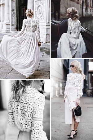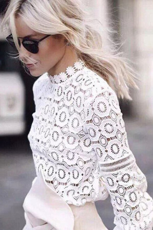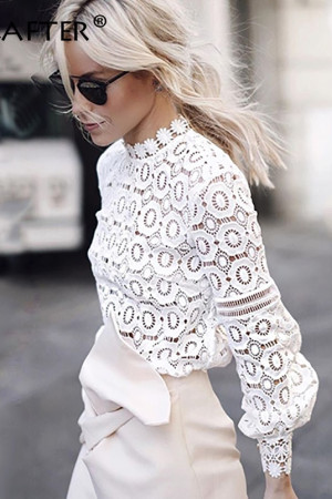 Luxurious White Lace Blouse with Embroidered Lantern Sleeves and Hollow Out Patchwork for...
