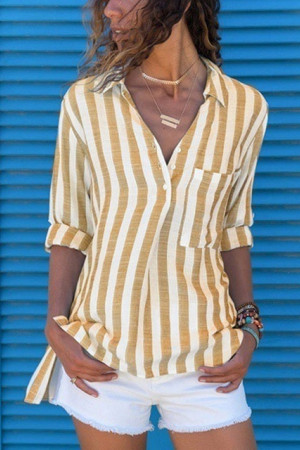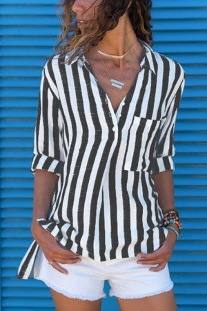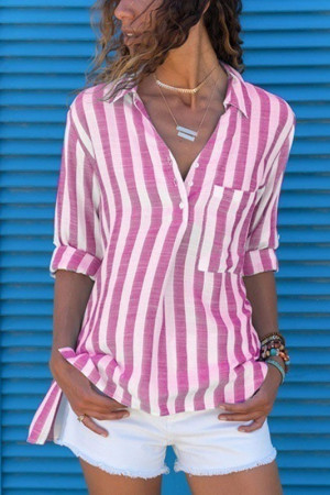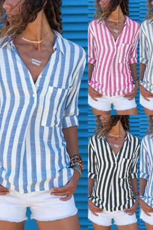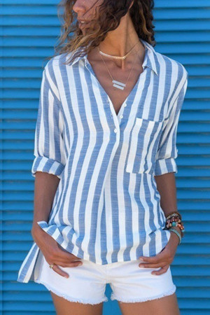 This casual style of clothing is made of a blend of polyester and spandex, with a regular length. It features pockets for decoration, a broadcloth fabric type, and a striped pattern. The sleeve length is full and the style is regular, with a turn-down collar.