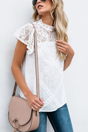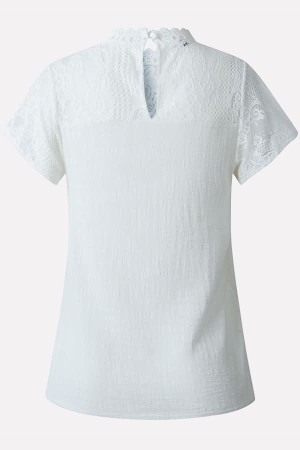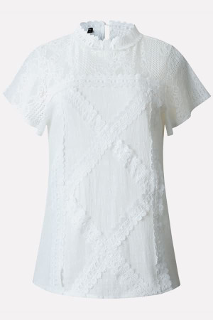 Women's White Lace Crochet Short Sleeve Mock Neck Casual Blouse