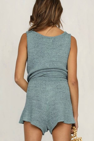 This casual tank top and shorts set is perfect for everyday wear. It features a light blue crochet v-neck with a drawstring waist, and a pair of matching shorts. The lightweight fabric is comfortable and breathable, making it ideal for warm weather. The drawstring waist allows for a custom fit, while the crochet detailing adds a touch of style. This set is perfect for a day at the beach or a casual outing.