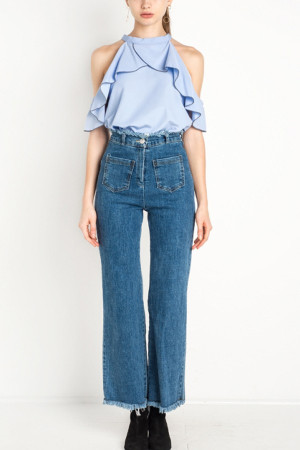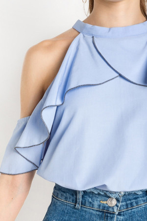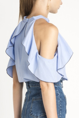 Elegant Light Blue High Neck Cold Shoulder Ruffled Blouse