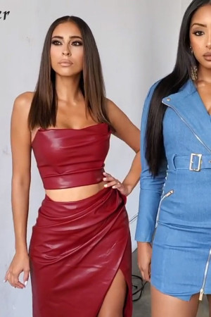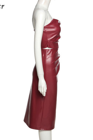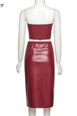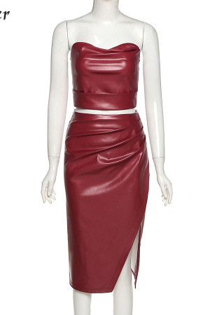 Leather Two Piece Set Tube Tank Top & Fork Design Skirt