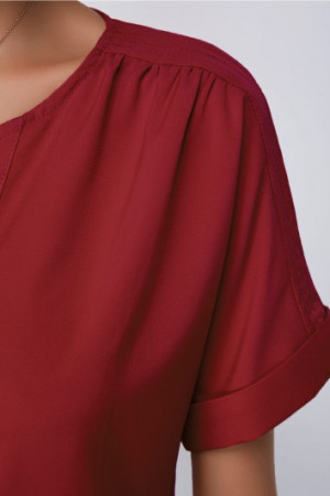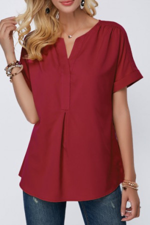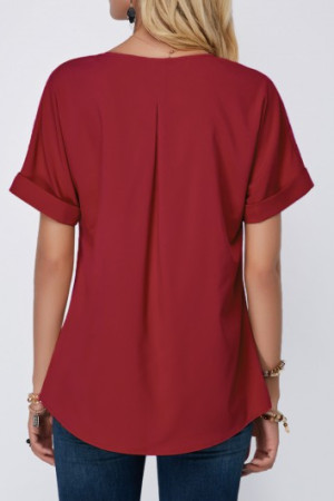 Elegant Wine Red Split Neck Short Sleeve Blouse