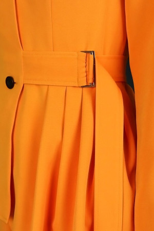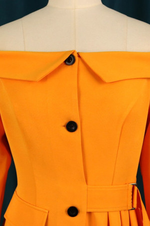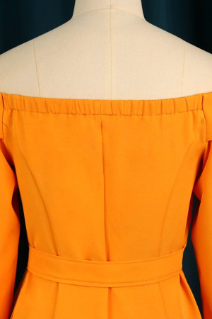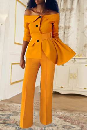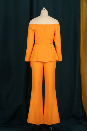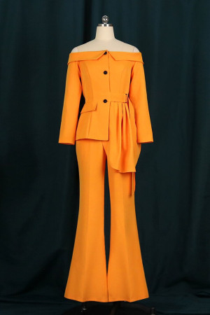 This elegant fashion office lady pants suit features a blazer top with a slash neck collar, single breasted closure, regular sleeve length, and knitted fabric. The pants feature a high waist, zipper fly closure, full length, skinny fit, and flare style. The material is a blend of polyester and cotton, with synthetic fiber material composition. The popular elements include collision color, perspective, stitching, and screen. The style is slim and the wide leg pants are a two piece set with beading and ruffles decoration.