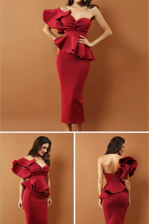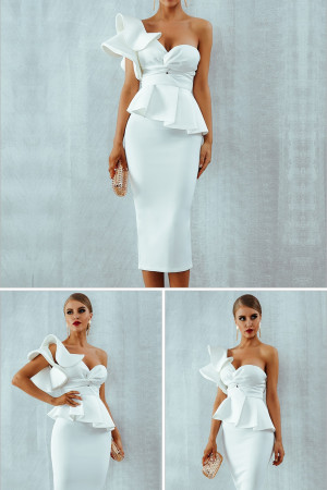 Bow&Ruffles One Shoulder Short Sleeve Bodycon Strapless Celebrity Evening Party Mid Dress...