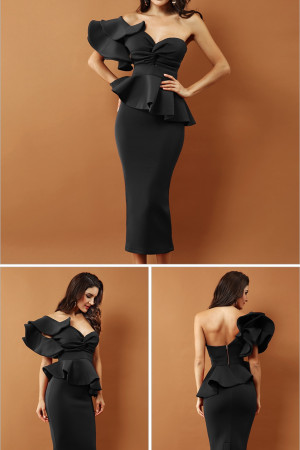 This women's clothing item is made of cotton and features a solid pattern, a one-shoulder sleeve, a strapless neckline, a sheath silhouette, an empire waistline, and cascading ruffles and zipper as decorations. It is suitable for evening parties, celebrity events, nightclubs, cocktail parties, and runways, and can be worn in all four seasons. It should be dry cleaned for washing.