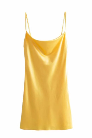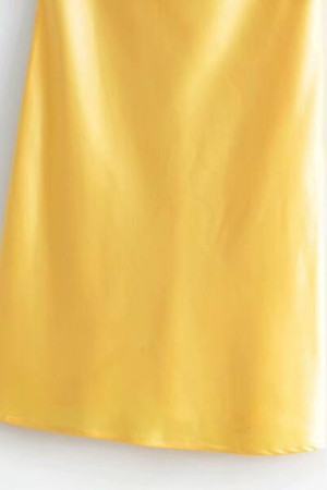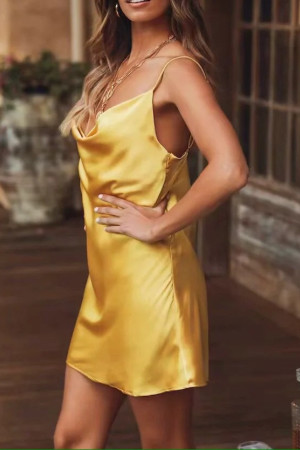 This summer dress is made of polyester and features a solid pattern type, faux silk fabric, an A-line silhouette, a slash neck neckline, sleeveless sleeve length, spaghetti strap sleeve style, draped decoration, and an empire waistline. It is perfect for office wear in the summer.
