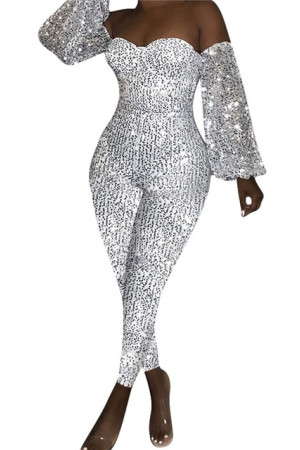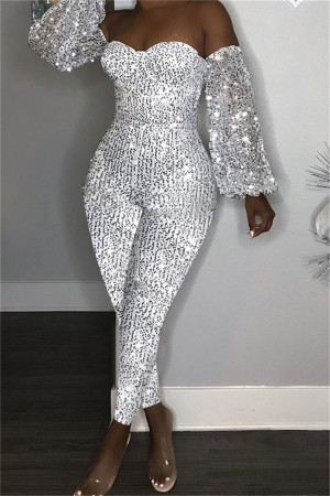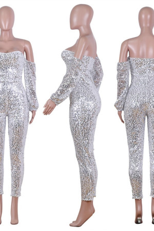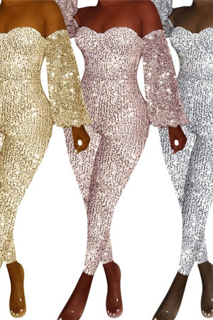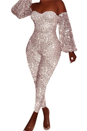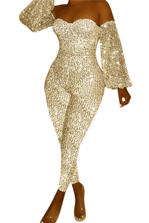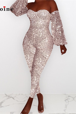 This jumpsuit is made of polyester and features a full length, broadcloth fabric, streetwear style, solid pattern type, skinny fit, sequined decoration, casual and fashion style, slash neck pattern, long pants length, moderate thickness, and is suitable for casual daily wear, school, home, and work. It offers a large discount for large orders.