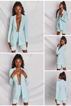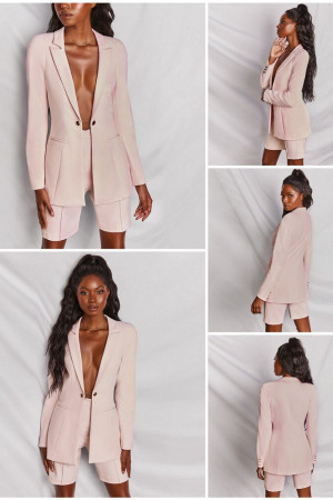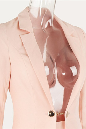 This ladies blazer suit is made of polyester and has a regular clothing length. It features an elastic waist pant closure, a notched collar, a single button closure, and a safari style. It has full sleeve length and is not customizable. It is a perfect office suit for women, providing a blazer set.
