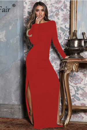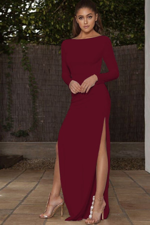 This black elegant backless high side split long sleeve dress is perfect for a party or cocktail event. Made from polyester with a microfleece fabric type, this bodycon dress features a boat neckline and a pullover closure for easy wear. The dress has a solid black color, making it a versatile piece that can be worn in the summer, fall, or spring. With its designer look and sexy theme, this dress is sure to make a statement and turn heads wherever you go.
