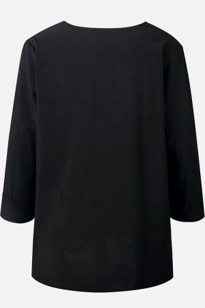 This chic black blouse features an asymmetrical neckline, long sleeves, and a button-down front. It is perfect for adding a stylish touch to any outfit.