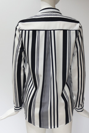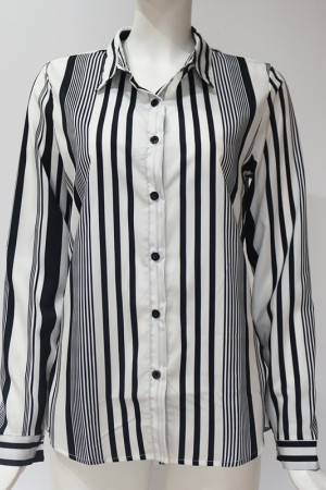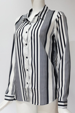 This long sleeve turn down collar striped chiffon blouse is a stylish and versatile addition to any woman's wardrobe. The black and white striped pattern gives it a classic and casual look, perfect for everyday wear. Made from chiffon fabric, it offers a regular fit and is easy to care for with machine washable instructions. Perfect for the summer and spring seasons, this blouse is a basic yet chic option for any occasion.