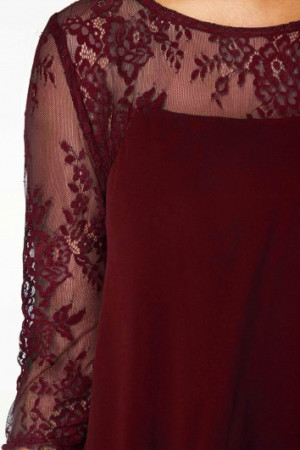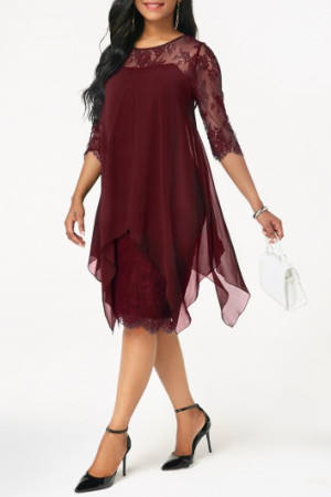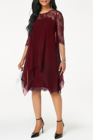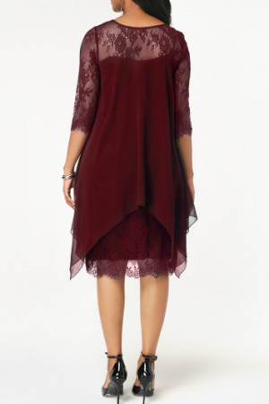 Elegant Wine Red Lace 3/4 Sleeve Dress