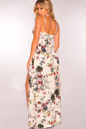Keep your look simply fabulous in this stylish skort dress! It features plunging v neck, spaghetti straps, graphic printed, sleeveless, backless, slit design and maxi length.