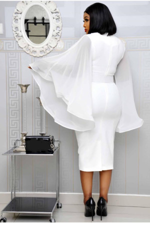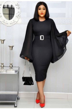 This is an autumn office lady style pencil dress made of polyester and chiffon with full length sleeves, a solid pattern, sashes decoration, a flare sleeve style, an empire waistline, and an O-neck.