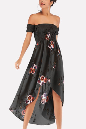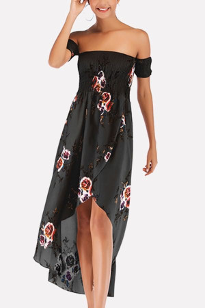 Romantic Black Floral Off Shoulder Chiffon Dress with Shirred Overlap Detail