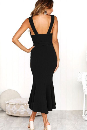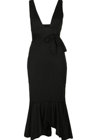 This Black Plunging Tied Waist Ruffles Mermaid Party Dress is a stylish and elegant dress perfect for any special occasion. It features a plunging neckline, a tied waist, and ruffles along the skirt for a mermaid-like look. The dress is made of a high-quality fabric that is comfortable and breathable, and it has a flattering fit that will make you look and feel your best.