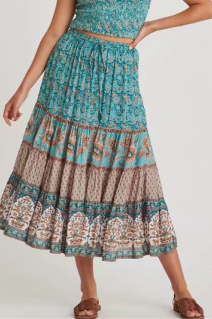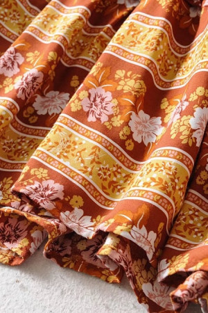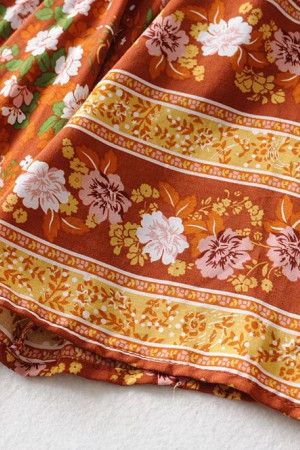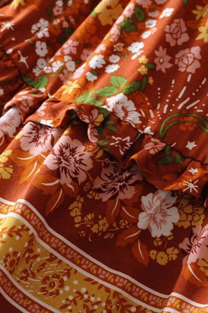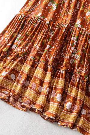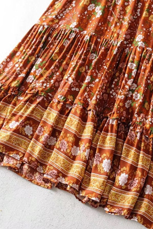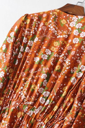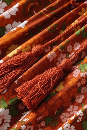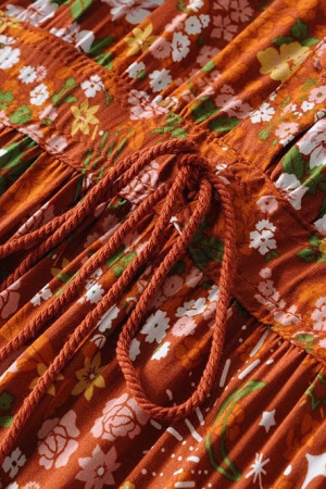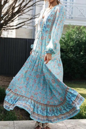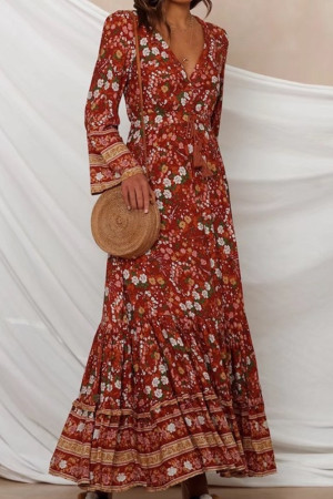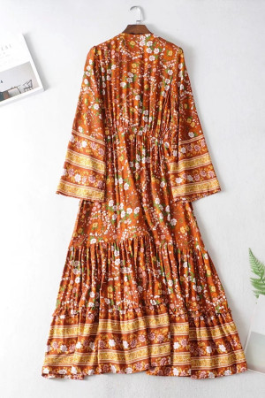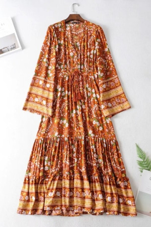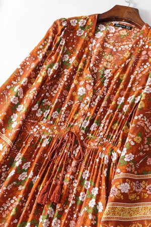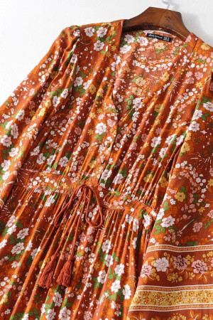 This bohemian-style dress is perfect for autumn. It is made from a combination of polyester and cotton and features a V-neck, full-length flare sleeves, tassel decorations, an empire waistline, and an adjustable waist. The silhouette is A-line and the pattern type is floral.