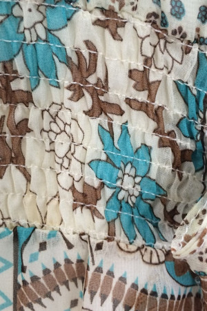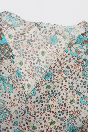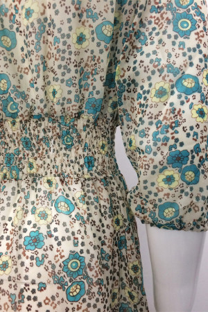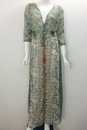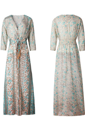 Bohemian Beauty: Floral Chiffon Long Dress with Three Quarter Sleeves and V-Neck