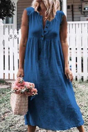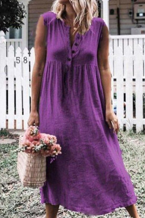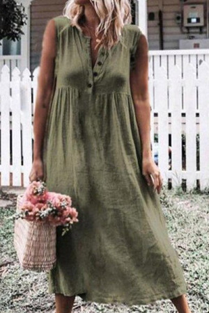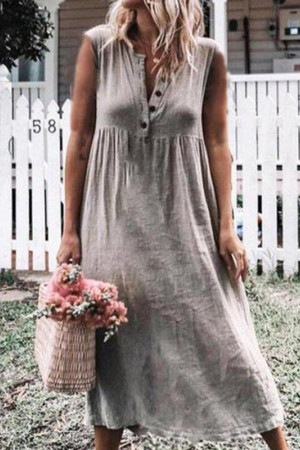 This summer casual pleated dress is made of linen and cotton, featuring a solid pattern, a V-neck neckline, regular sleeve style, natural waistline, and a sleeveless design with buttons as decoration.