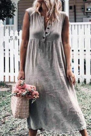 Summer Breeze: Elegant Soft Button Pleated Linen Sleeveless Midcalf Length Beach Dress