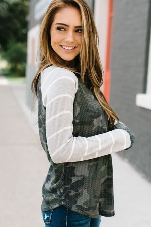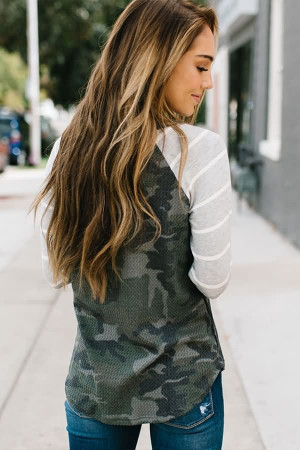 This casual top features an army-green camouflage pattern with stripe splicing for a stylish look. It is made from a soft and comfortable material, making it perfect for everyday wear. The top has a round neckline and short sleeves, and the stripe splicing adds a unique touch.
