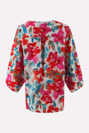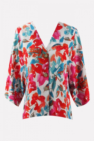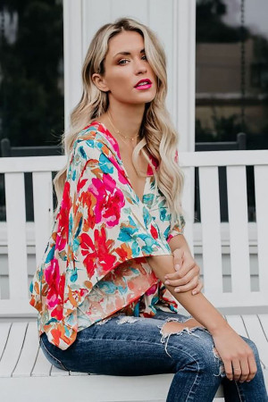 This casual blouse features a hot pink color, a button up front, bat sleeves, and a V neckline. It is perfect for everyday wear and can be dressed up or down.