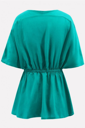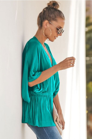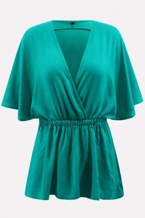 Teal Enchantment: Wrap Peplum Bat Sleeve V Neck Casual Blouse