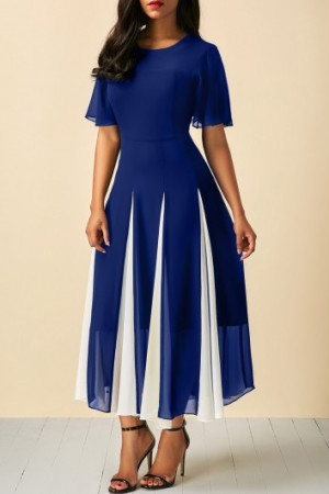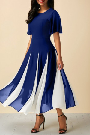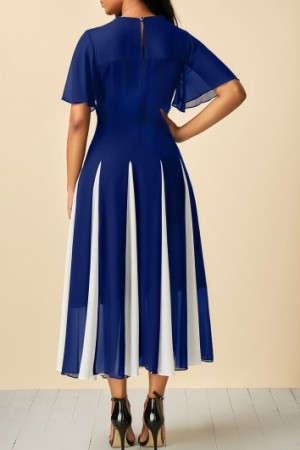 This is a casual, patchwork dress with a round neck, butterfly sleeves, short sleeves, high waist, and maxi length. It is made of polyester and comes with one dress. It is available in US sizes 4-20 and has corresponding bust, waist, and hip measurements.