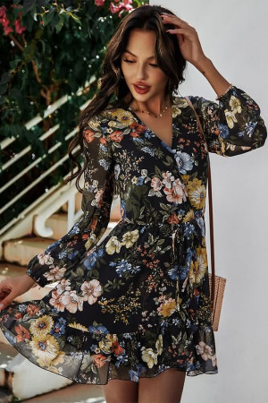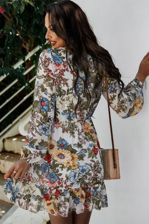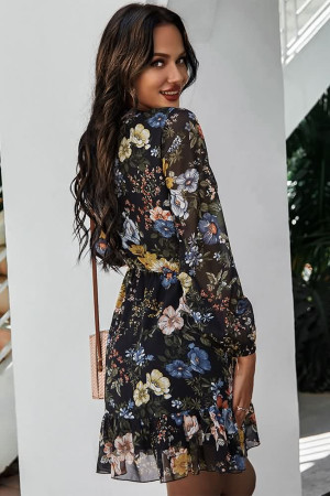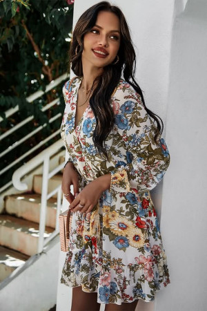 Beautiful Blooms: Floral V-Neck Tied Waist Ruffles Hem Long Sleeve Casual Chiffon Dress