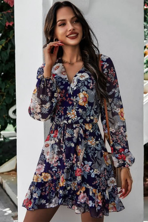 This casual chiffon dress features a floral print, a V-neckline, a tied waist, ruffles at the hem, and long sleeves. It is perfect for any occasion, from a casual day out to a night on the town.
