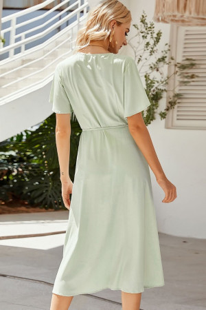 This light green casual dress features a wrap silhouette with flounce sleeves, a belt to cinch the waist, and a slit for added movement. Perfect for a day out or a casual evening, this dress is sure to make a statement.