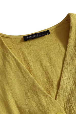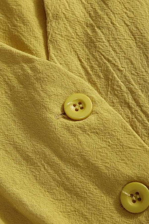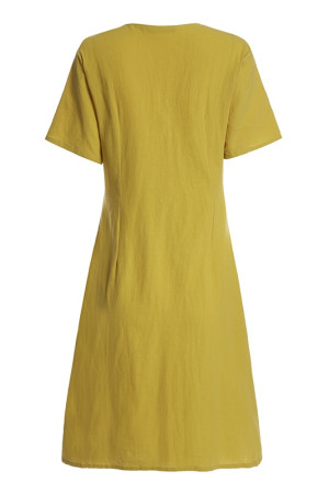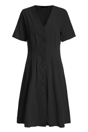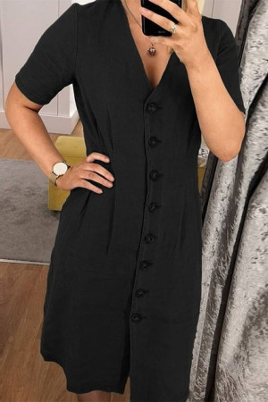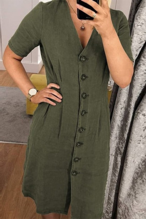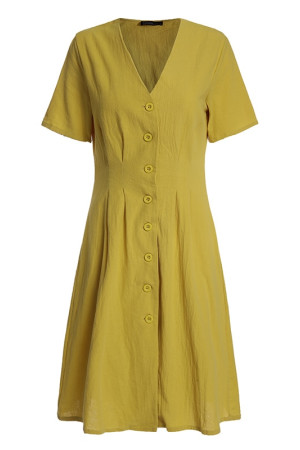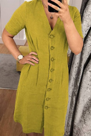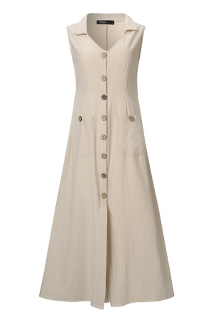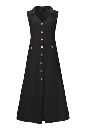 This casual summer dress is made of cotton and has a loose silhouette. It features a V-neck, tank style sleeveless design, buttons for decoration, and a natural waistline. The pattern is solid.