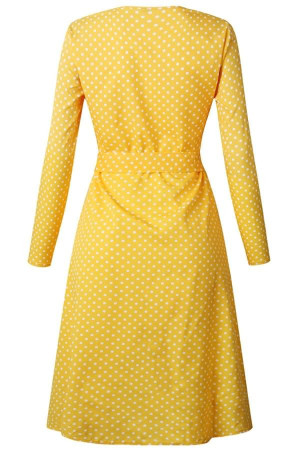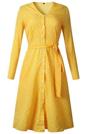 Cheerful Yellow Polka Dot Button Up Tied Long Sleeve A Line Dress for Casual Wear