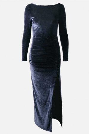 This dark blue velour maxi dress is perfect for a special occasion. It features a ruched bodice, a high slit, long sleeves, and a backless design. The luxurious fabric and flattering silhouette make this dress a showstopper.