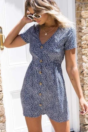 This casual A-line dress features a dark blue floral print, a v-neckline, and buttons up the front. It is perfect for everyday wear and can be dressed up or down depending on the occasion.