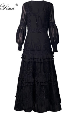 Elegant Spring Vacation Dress with Embroidered Flowers and Cascading Ruffles