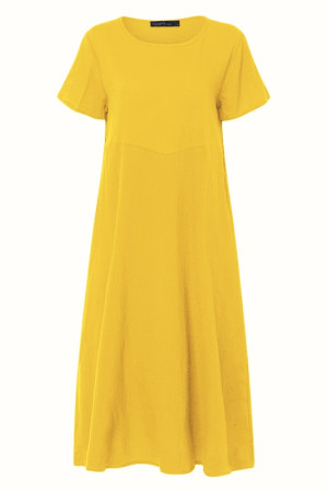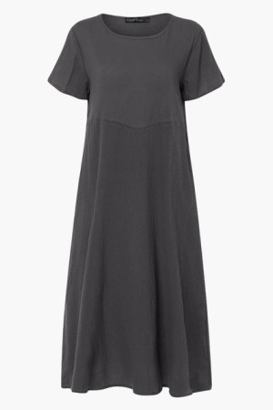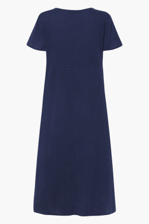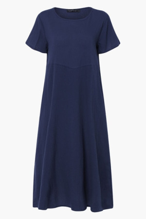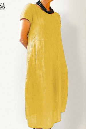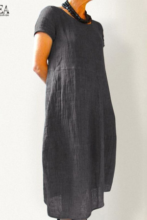 Vintage Elegance: Linen Midi Dress Summer Sundress with Short Sleeves and Pleated Neckline