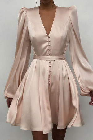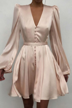 Gorgeous Spring Party Dress - Elegant Solid Silk Satin Deep Neck Lantern Sleeve Mini High...