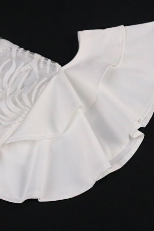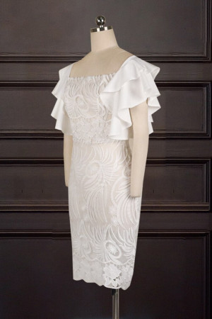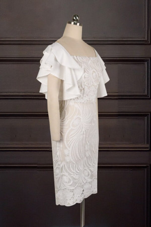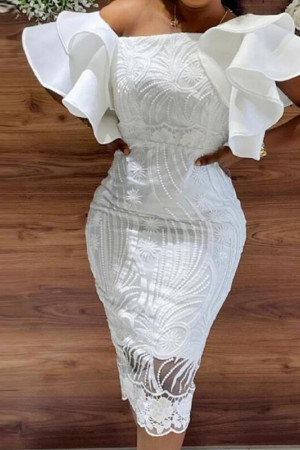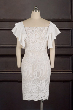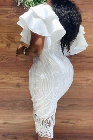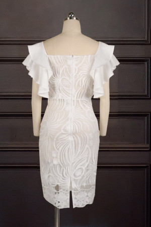 Elegant White Lace Ruffle Sleeve Slim Fit Knee Length Dress - Perfect for Christmas, Birthday,...