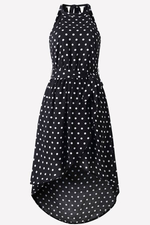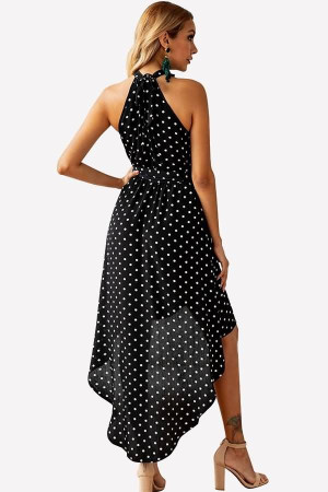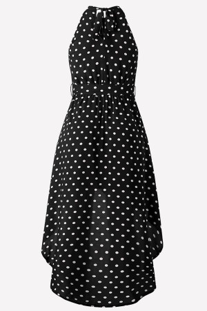 This casual dress features a black polka dot pattern, a mock neck, a high-low hemline, and a belt at the waist. It is sleeveless and perfect for any casual occasion.