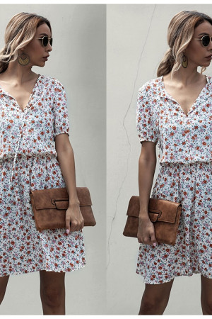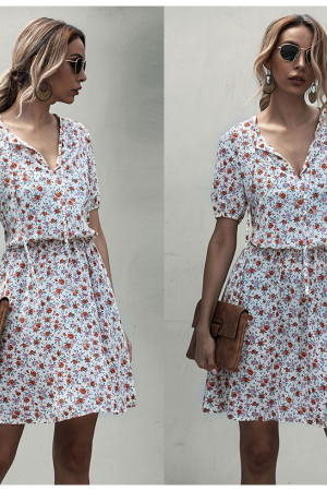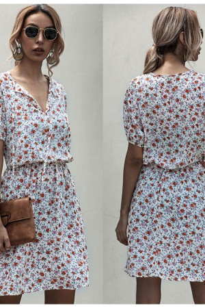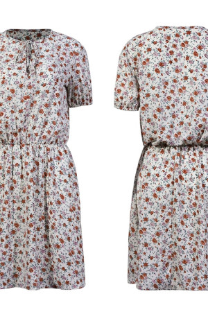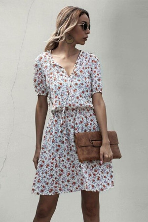 This summer dress features a prairie chic young style with an A-line silhouette, bow neckline, short regular sleeves, empire waistline, and a floral pattern. It is made of a cotton and polyester blend and has no decoration.