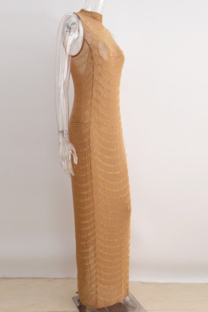 This elegant dress features a halter neckline, sleeveless style, and a pullover closure. It is made of a polyester and spandex blend with a synthetic fiber material composition, and is decorated with crystal studs. The silhouette is a sheath, and the waistline is empire. It is perfect for autumn, and the pattern is solid.