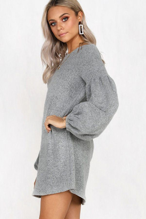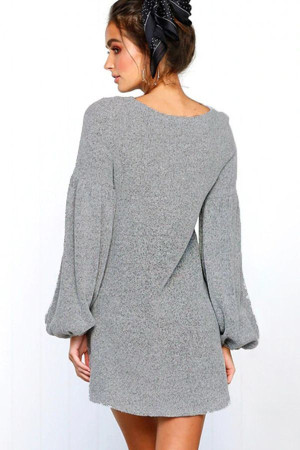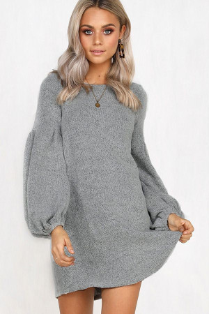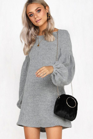 Chic Gray Puff Sleeve Round Neck Shift Dress for Casual Days