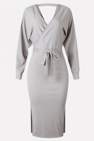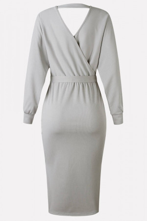 Chic Gray Wrap-Tied Long Sleeve Bodycon Sweater Dress